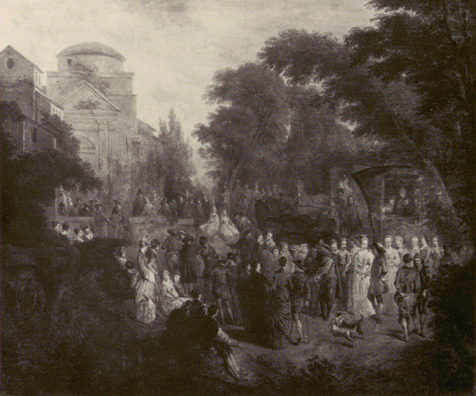 Sale, Paris, Ader, Picard, Tajan, April 25, 1989, lot 89: “École Française du milieu du XVIIIe siècle. Scène galante avec architecture et une calèche arrivant dans un parc. Toile. 74 × 90 cm. Sans cadre. Voir la reproduction en couleurs sur la couverture.”