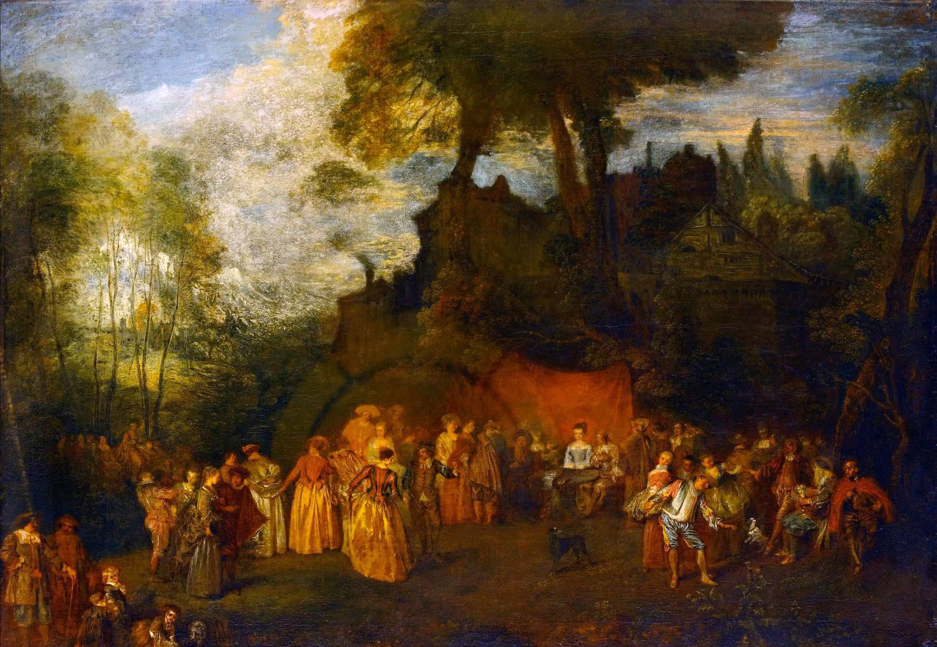 Another noticeable aspect of Watteau’s picture is its explicitly italianate landscape. The large umbrella pine trees dominating the foreground are more evident here than in any other Watteau painting. It draws attention to itself. Certainly the artist‘s contemporaries would have been well aware that this was not a species of tree found in Paris and the Île de France. Equally important is the architectural environment, especially the domed and pedimented church. It has caught the eye of all critics writing about the painting. Some have described it alternatively as analogous to the Pantheon, the facade of a Palladian church, or a theatrical backdrop.