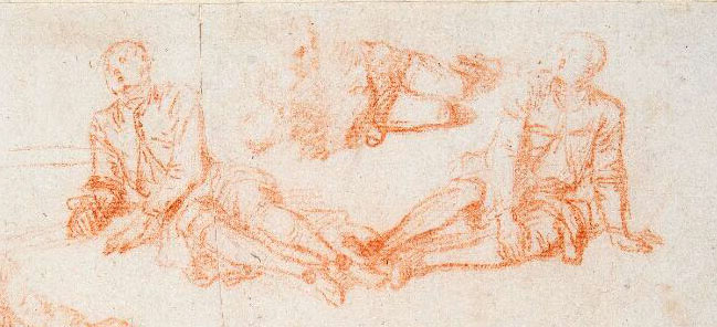 The one Watteau drawing that can be directly linked to La Chute d’eau is a an early sheet of studies of men, mostly sitting or reclining, now in the Stockholm Nationalmuseum (Rosenberg and Prat 122). At the very top of the page is a figure of a recumbent man who rests his head on a bent arm, and he corresponds to the figure at the left of the foreground group in the painting. Because this sheet is a weak counterproof, only his other arm, crossing his body, and the direction of his head are easily understood. More of this figure would have been visible in the original chalk study. The sheet now in Stockholm is one of a group bought from the artist in 1715 by Swedish count Charles Gustav de Tessin. This means that the original drawing was made no later than 1715—a date that may help determine when the painting was executed.