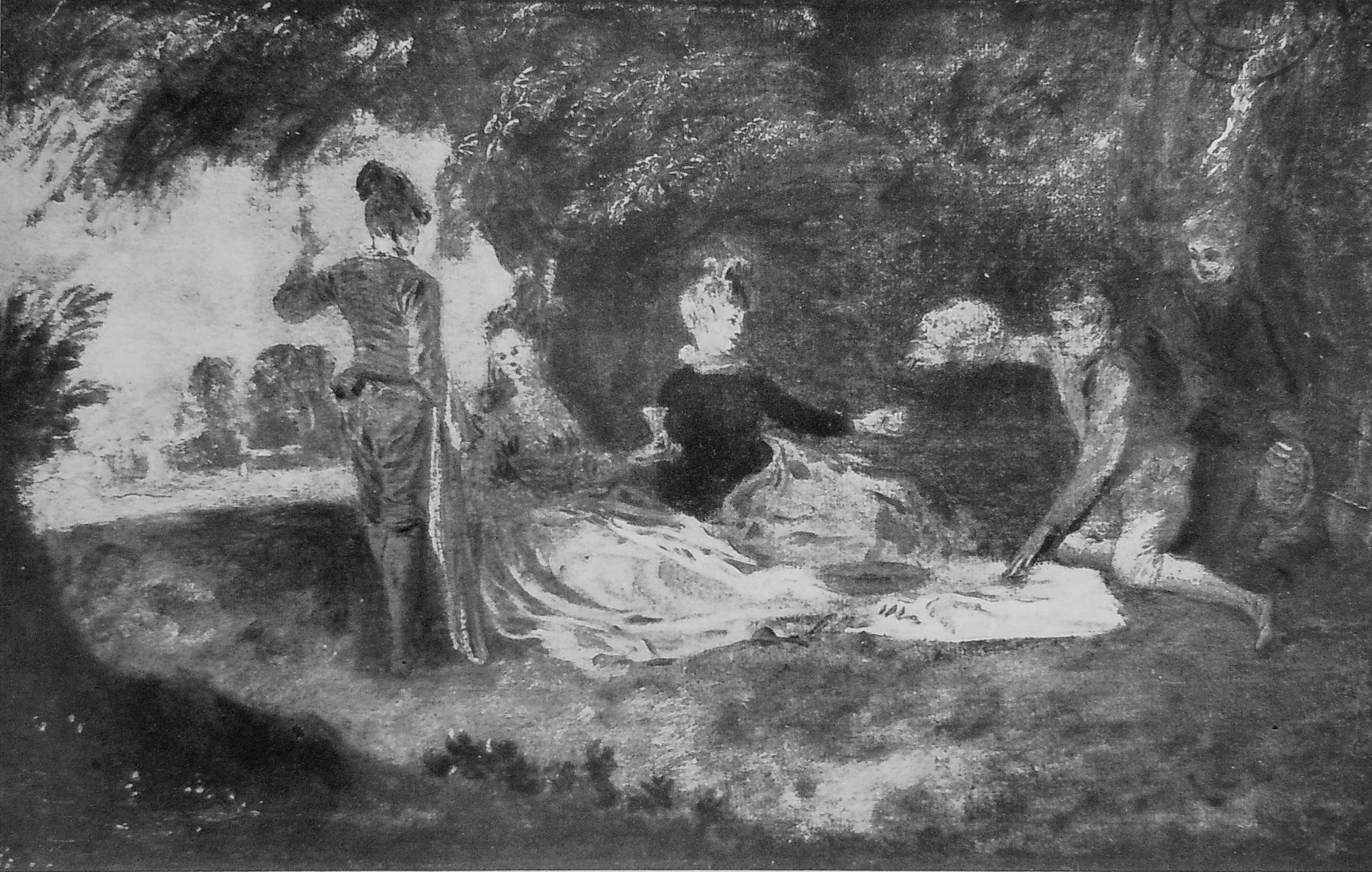 Paris, collection of M. X (avocat général). His sale, Paris, April 14, 1866, lot 24: “WATTEAU (Antoine) . . . La Collation sur l’herbe. Charmante esquisse avec variantes du tableau gravé du maître. Peint sur toile. Larg., 33 cent.; haut., 22 cent.”