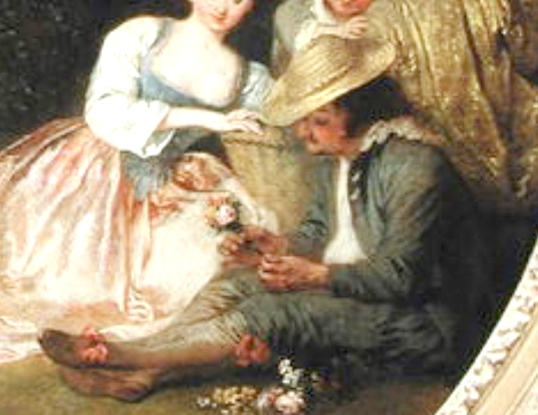 Revérends Pères Augustins du grand Couvent, September 22ff, 1774, lot 107: “ANTOINE WATTEAU. . . . Un Tableau, sur toile de 24 pouces de haut, sur 18 de large. Il représente un groupe de six figures, dont un paysan assis qui tient un bouquet, une fille qui le regarde ayant les mains posées sur un panier, un homme joue de la flute, plusieurs arbres ornent agréablement le fond de cet tableau.” Sold for 400 livres to Pierre Remy.Paris, with Pierre Remy (active c. 1749-c.1787; art dealer).