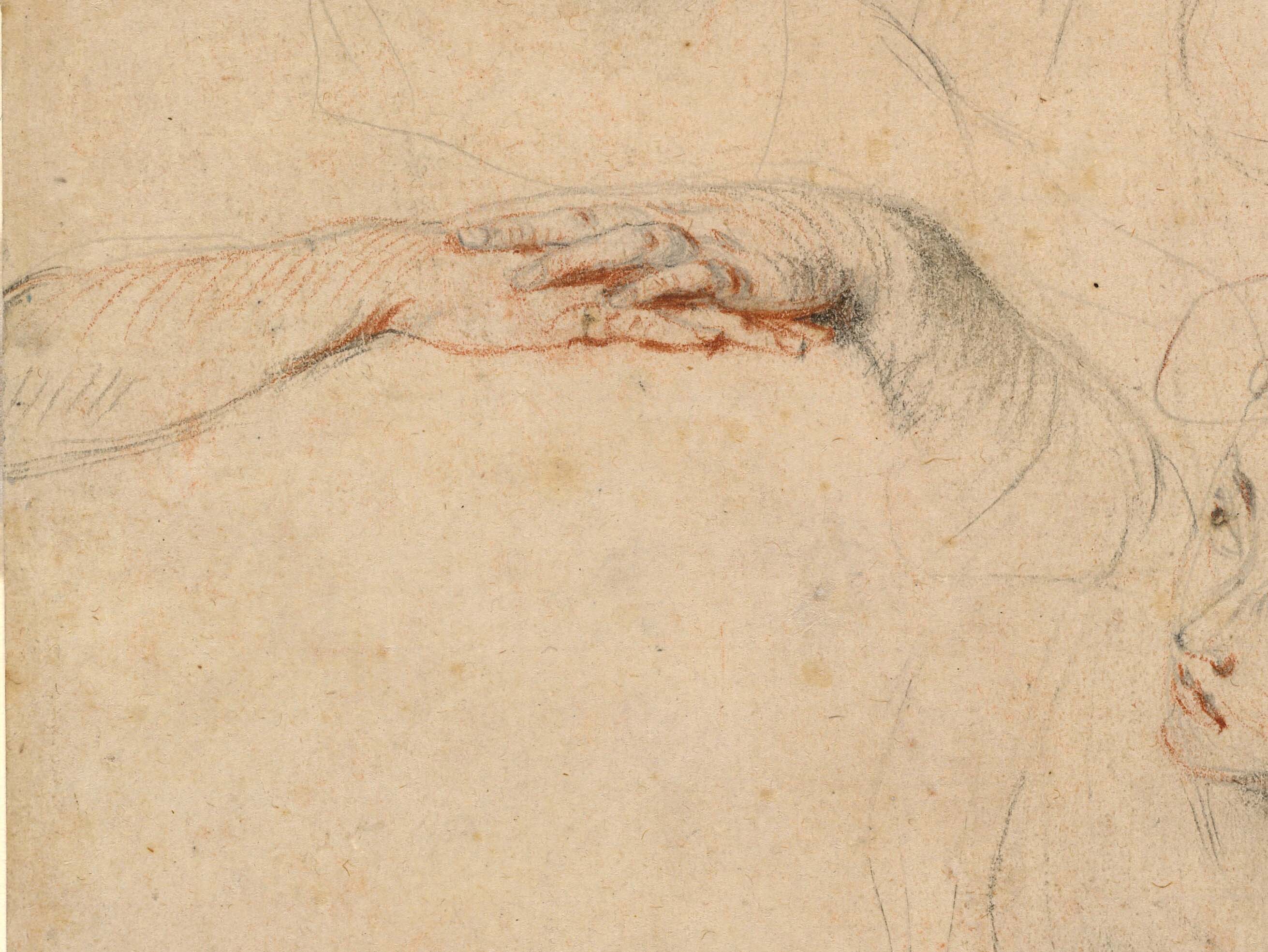 Watteau, Sheet of Studies (detail), red, black, and white chalk. Paris, Musée de Petit Palais.