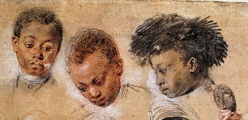 Likewise, the young black servant is not a stock character in the commedia dell’arte. Instead, he resembles the servants in several other Watteau paintings, such as Les Plaisirs du bal in Dulwich and Le Concert champêtre, a group portrait of the Bougi family. He especially resembles the servant in Les Charmes de la vie in the Wallace Collection. In that painting the young man's pose reflects his handling the wine bottles in a bucket, whereas in Coquettes qui pour voir his pose seems unjustified. He looks as if he is peering intensely at the balustrade.