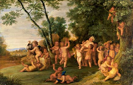 The classical subject of Watteau's painting strikes an unusual but not a unique note in his oeuvre. In fact he turned to the theme of children parodying classical gods, of course, in L’Amour mal accompagné and also Les Enfants de Bacchus. He also portrayed children parodying the commedia dell’arte as in Les Enfans de Momus and La Cause badine, and created charming allegories of the Four Seasons. He did not break new ground in what was a well-established genre but, rather, followed the lead of predecessors among the followers of both Poussin and Rubens. Peter van Avont’s playful Bacchic Procession, for example, although painted more than a half century before Watteau’s, contains similar paraphernalia and jocular activity as in Les Enfants de Sylène. More immediate, Watteau would have been schooled in such parodies of the classical gods by his master, Claude Gillot, who made countless drawings and engravings of this type.