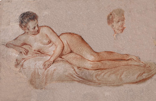 On the other hand, the background of the drawing is extremely problematic. Whereas the nude was drawn in red chalk, and then received vivid accents—black chalk to the hair, white chalk highlights to the body—the background was drawn far less precisely, in a combination of black and red chalk. The sheet is a palimpsest that includes three quickly sketched indications of women. The one at the upper reach of the page evidently extended beyond the edge; it faces the woman. Slightly lower, inclined, and facing toward the right like the nude herself, is a second head. The third and dominant study shows a female attendant, preparing to administer an enema to her lady. It is evident that Watteau drew the recumbent nude first, and these other elements were drawn later and quite specifically do not overlap the nude body. The rapidly drawn hachures do not cover any part of the nude woman.