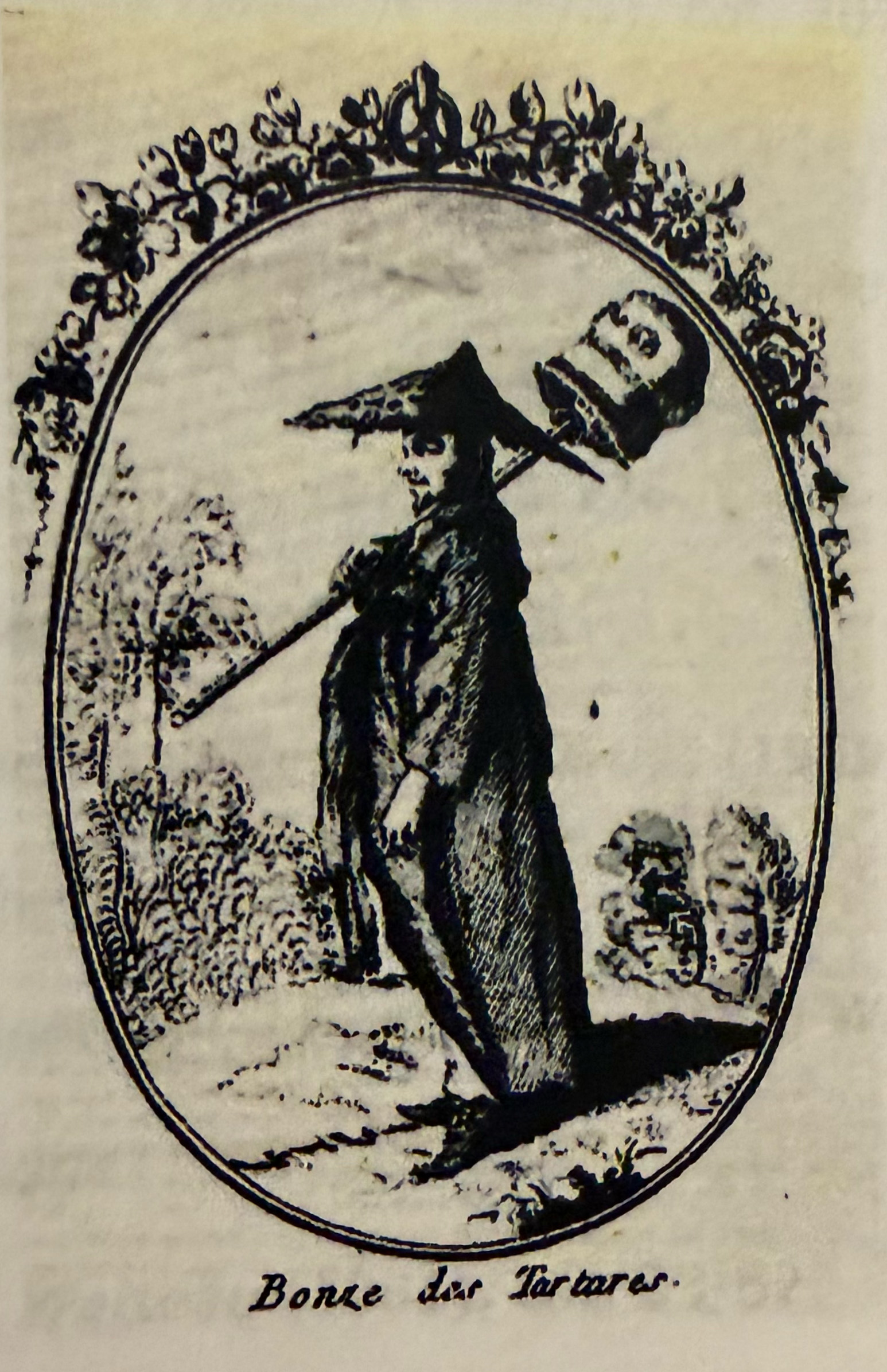 A notable aspect of the La Muette chinoiseries is that the figures are not generic Chinese men and women. Rather, they are from specific regions including regions outside of China proper. Moreover, many of these men and women have specific professions. A good example is the representation of a monkin Talagrepo ou bonze de Pégou (Pegou or Bago is a port in southern Burma, now Myanamar). The man’s notched staff and shaved head are accurate and are the type of visual data that must have come from an informed source. Moreover, as Bellevitch-Stankevich recognized more than a century ago, the names on some (probably many) of the Jullienne engravings are not personal or family names but, instead, designations in Chinese of their respective ranks or trades. Thus, I Geng, médecin chinois is not a particular doctor’s name but, rather, a transliteration of “yisheng” which literally means “doctor.” Similarly, Nikou, femme bonze ou religieuse chinoise is a transliteration of “Buddhist priest.”