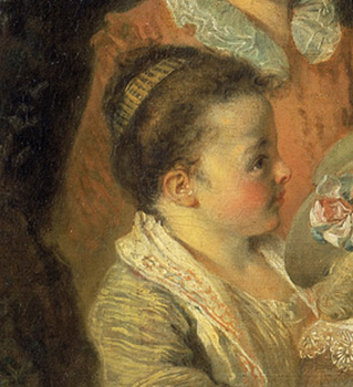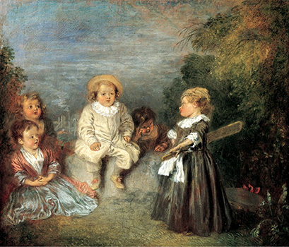 Iris, c'est de bonne heure is one of several pictures that Watteau painted where children assume adult roles and display adult emotions. Its basic composition can be favorably compared with other, well-known fêtes galantes such as La Danse paysanne. There, as in Iris, c'est de bonne heure, a woman spreads her skirt outward and assumes a dance position, and she is accompanied by a musician and onlookers as well as a sleeping dog. The idea of children taking adult roles was something that the artist explored in other paintings, such as Heureux age! Age d'or. In short, although an exceptional and beautiful work, Iris, c'est de bonne heure fits comfortably within the canon of Watteau's paintings.