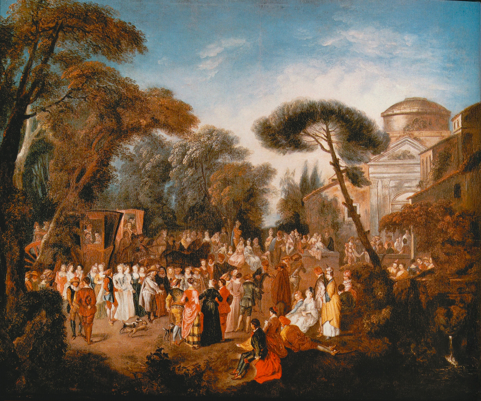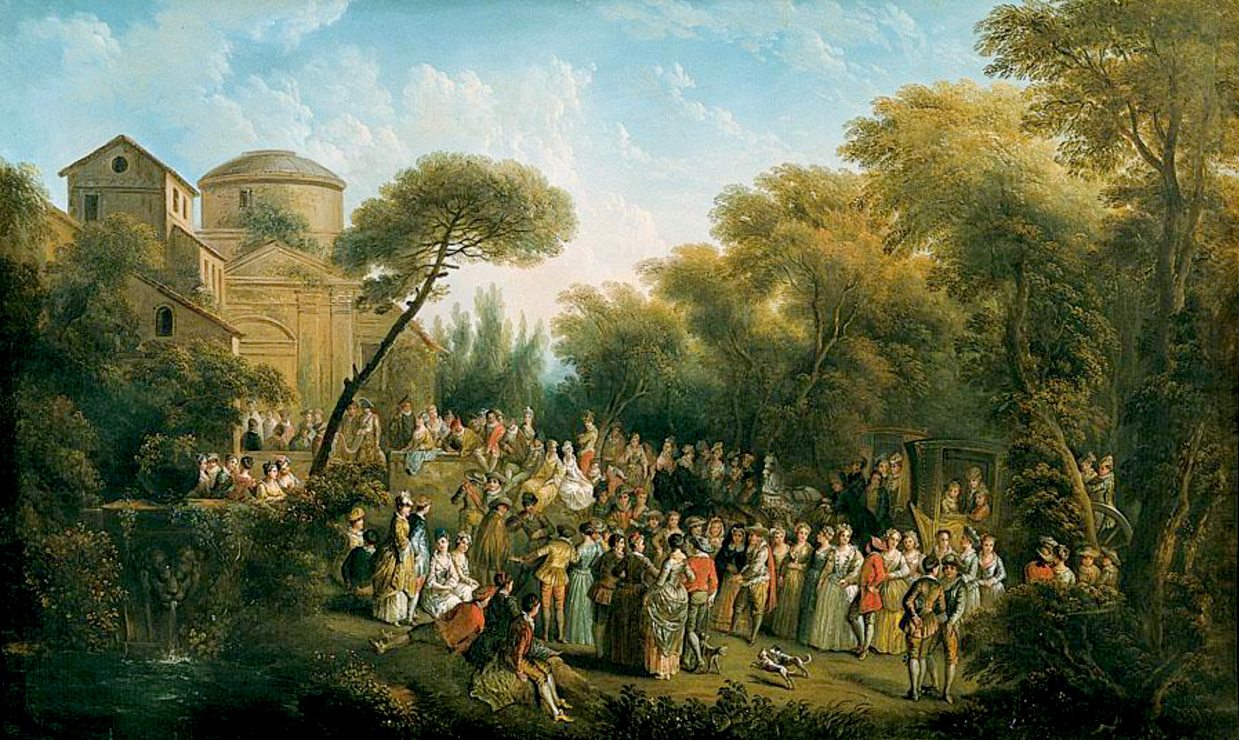 Nearer to the front a lady in blue sits between a youth dressed in an amber suit and another in red. They are watching a group of figures who are promenading toward the center of the composition, where a fiddler stands. Beyond them at the right is a row of spectators, at the back of whom appear two coaches, one being drawn by a pair of gray horses.