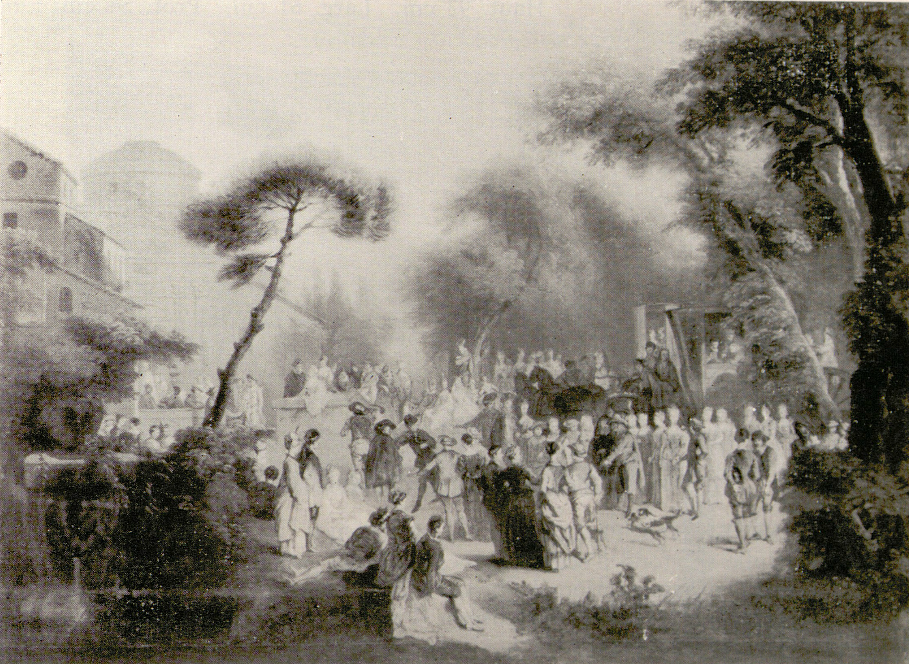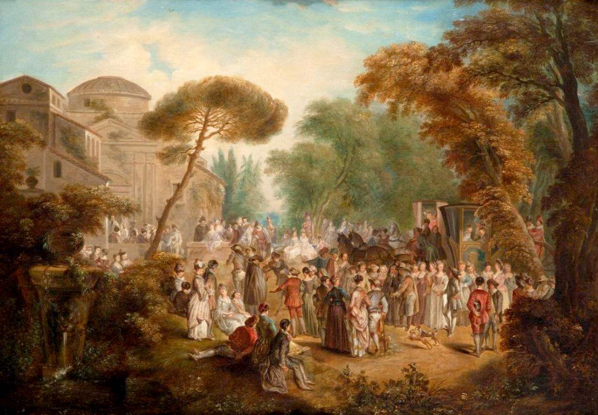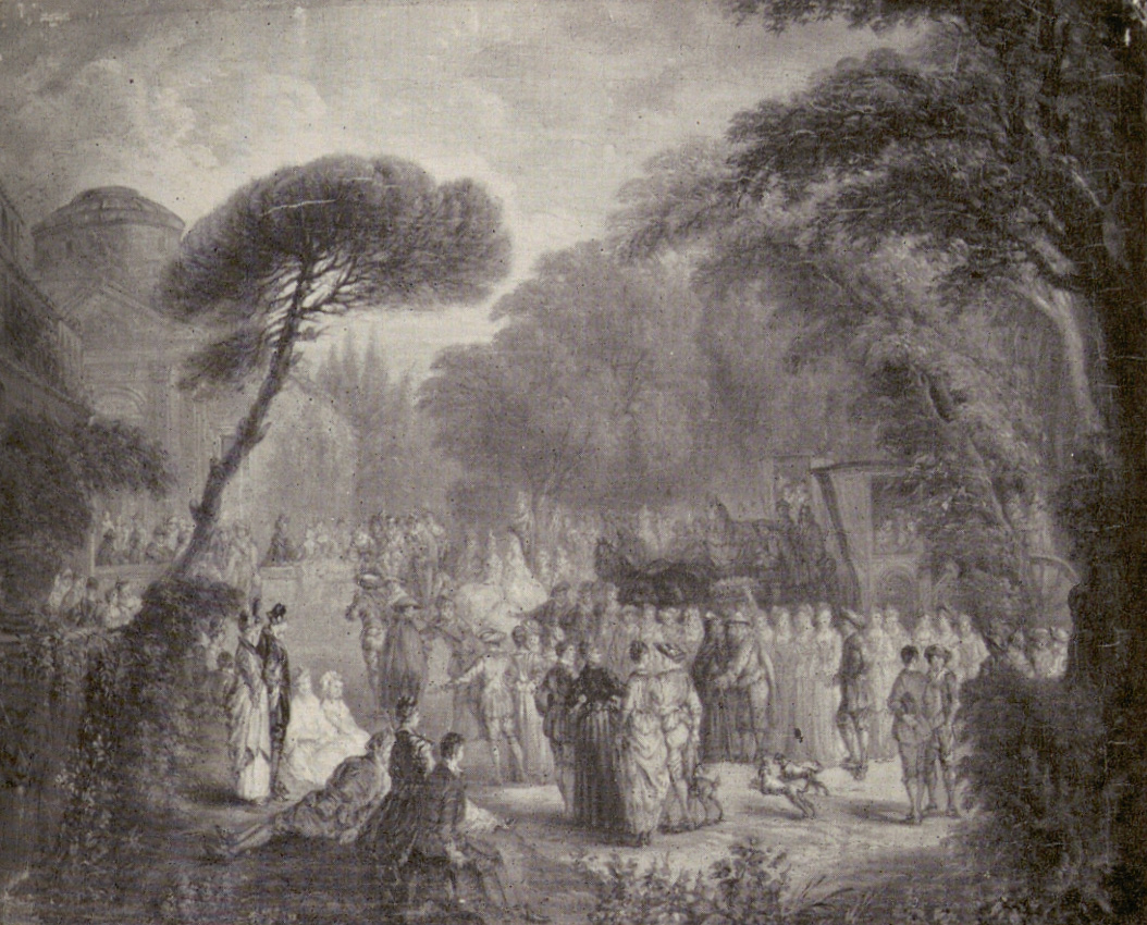 Berlin, sale, Lepke, May 16, 1933, lot 299: “CLAUDE GILLOT. ZUGESCHRIEBEN. . . EIN GARTENFEST. Eine zahlreiche Gesellschaft von Herren und Damen im Park, dabei Musikanten. Links eine vergoldete Sänfte, rechts ein großer tempelartiger Bau. Lwd. Gr. 95 ×130 cm. Geschnitzter G.-R.”