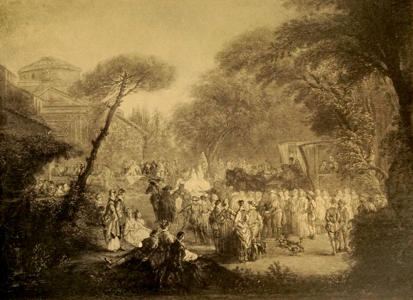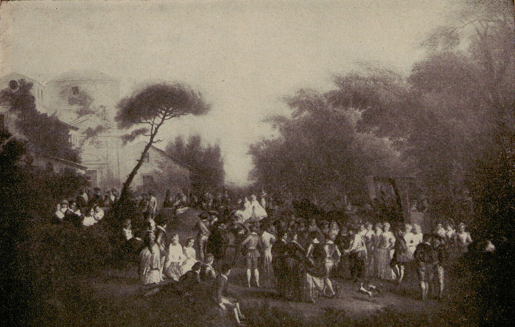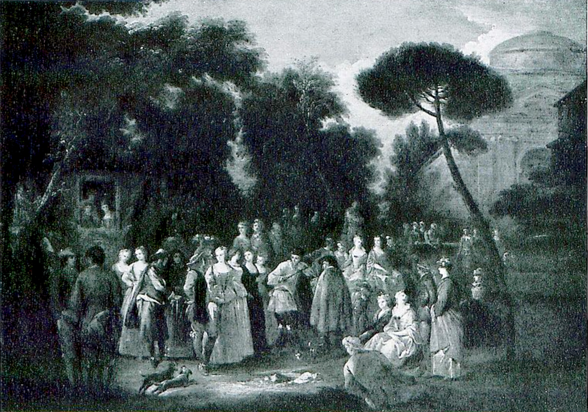 New York, collection of Guy Reginald Bolton (1882-1979; Anglo-American playwright); his sale and others, New York, American Art Association, February 19, 1912, lot 96: “JEAN ANTOINE WATTEAU . . . FÊTE CHAMPÊTRE / Height, 10½ inches; length, 14 inches. The garden scene, flanked on the right by luxuriant foliage and terminating at the left in a villa, surmounted by a dome, is animated with a profusion of dainty figures. At the left of the foreground beside a pool, which is fed by a stream of water from a lion's mouth, rises a rock pine. Beneath the latter, a lady in an old-rose and white costume, accompanied by a gentleman, stands in conversation with two ladies in white who are seated on the grass.
