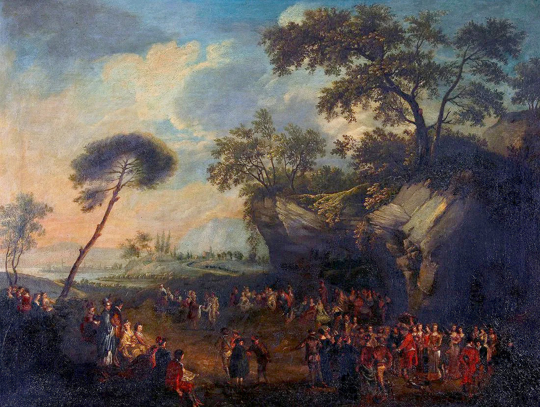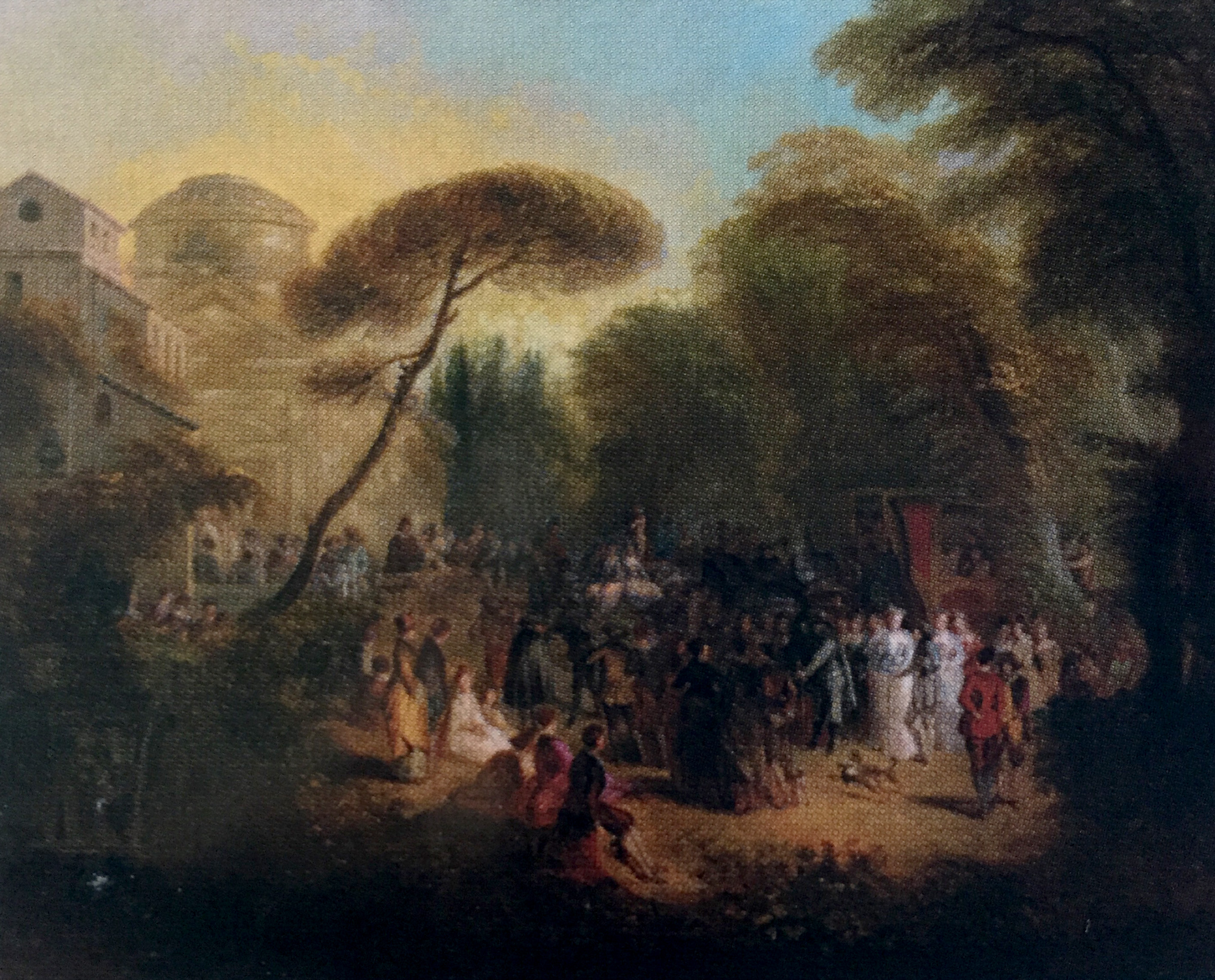 The painter responsible for this picture had a distinctive approach. Although he faithfully copied the many figures from La Mariée de village, he did not retain them as a whole configuration. Rather, he separated them into small clusters that he then distributed into a vast landscape of his own devising. The result is a picture that is more a landscape than the Watteaus‘ figurative composition. A similar approach can be seen in another of his variants after La Mariée de village—our copy 14. These and similar variations after Watteau have an English provenance, and may indicate the copyist’s nationality.