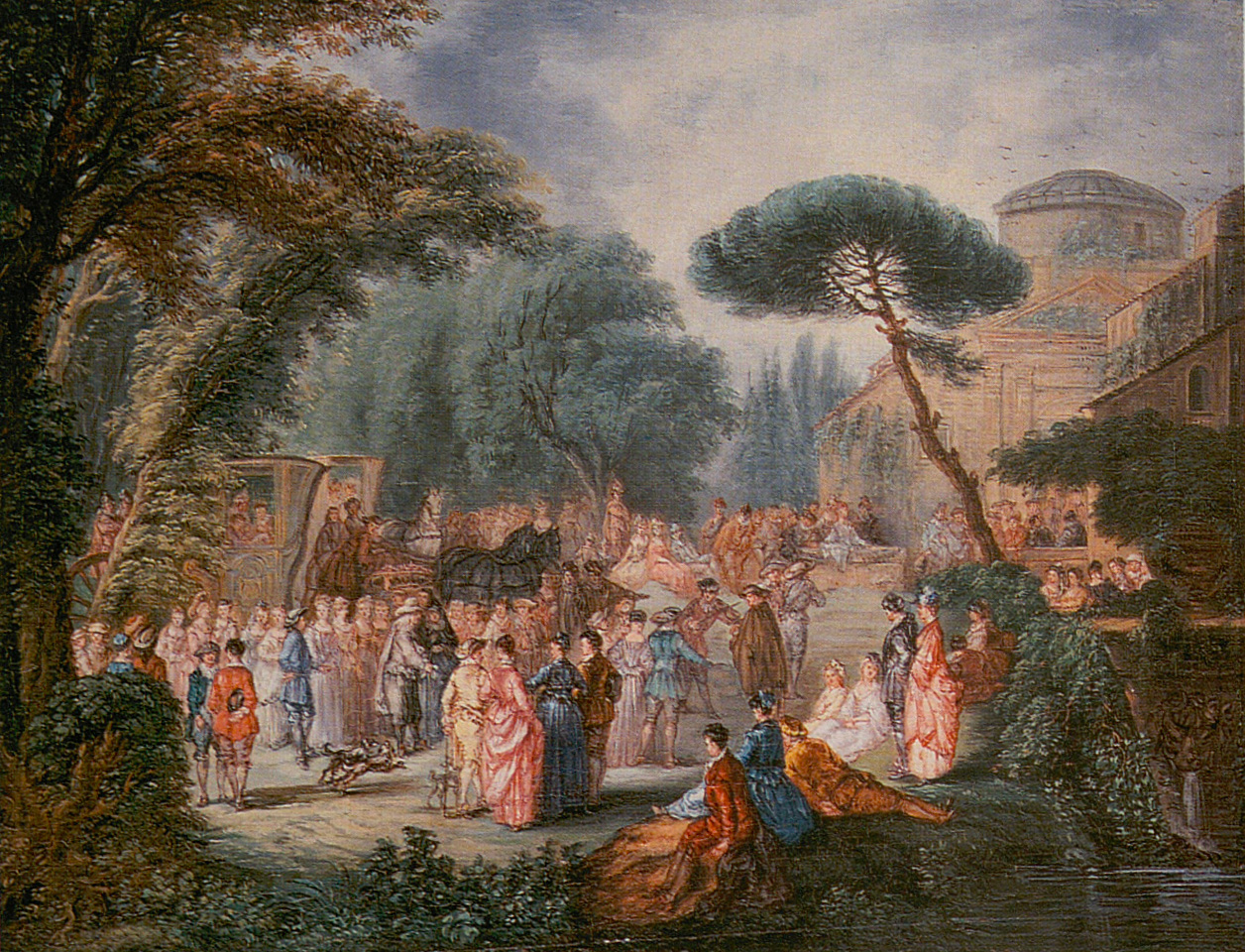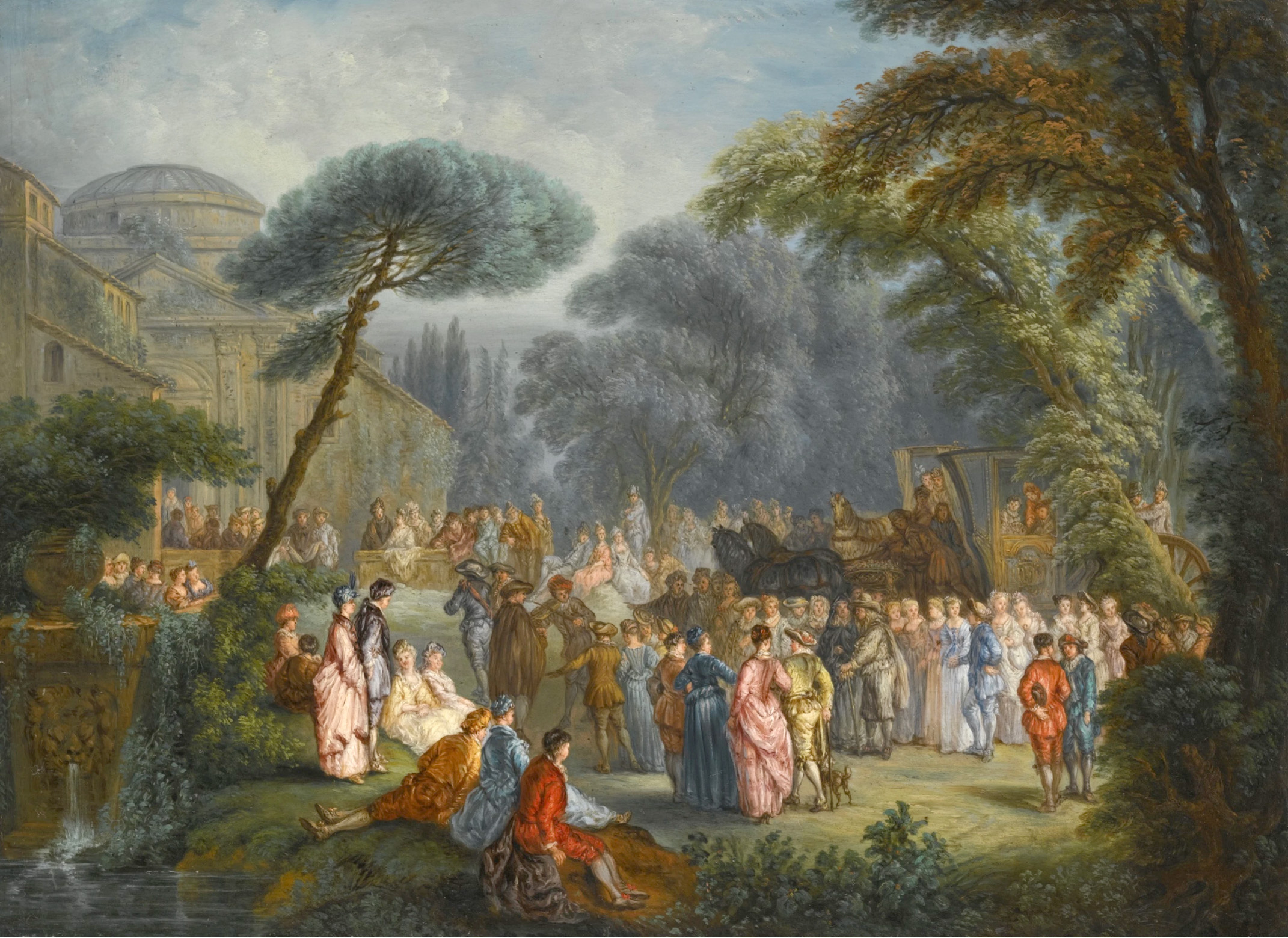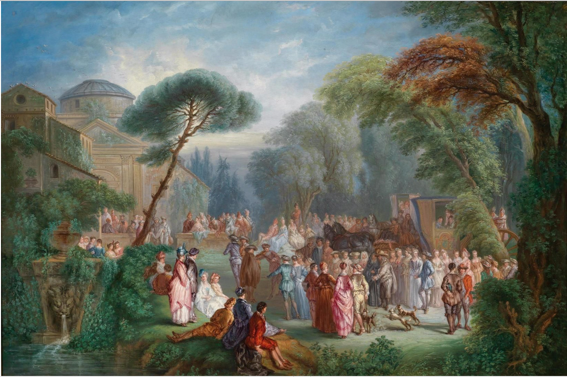 Sale, Paris, Ader, Picard, Tajan, April 25, 1989, lot 89: “École Française du milieu du XVIIIe siècle. Scène galante avec architecture et une calèche arrivant dans un parc. Toile. 74 × 90 cm. Sans cadre. Voir la reproduction en couleurs sur la couverture.”