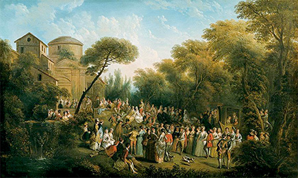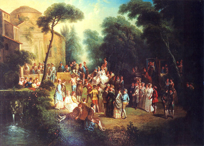 This painting, in the reverse direction of Watteau’s composition, must have been executed after the print by Charles Nicolas Cochin.