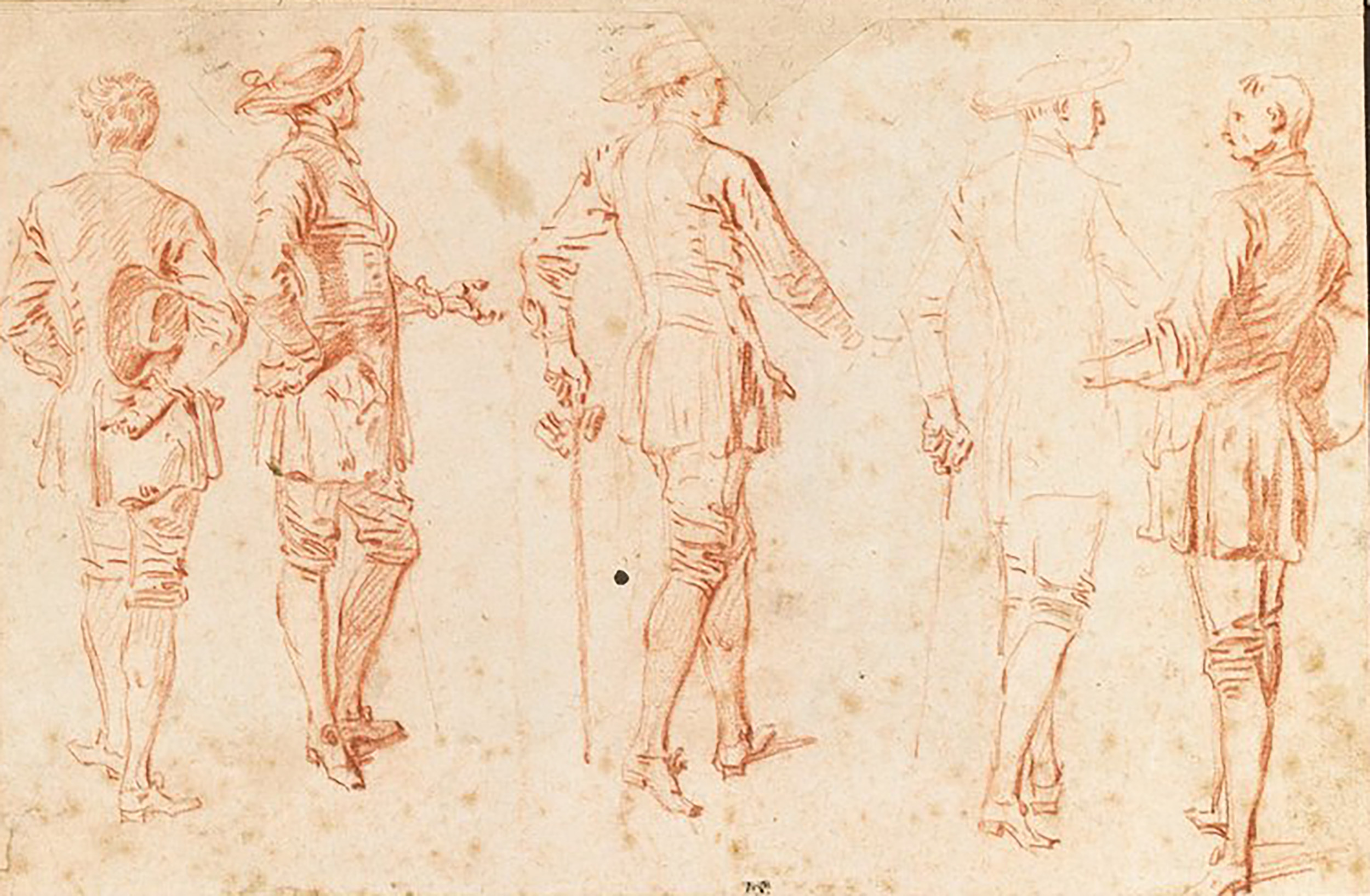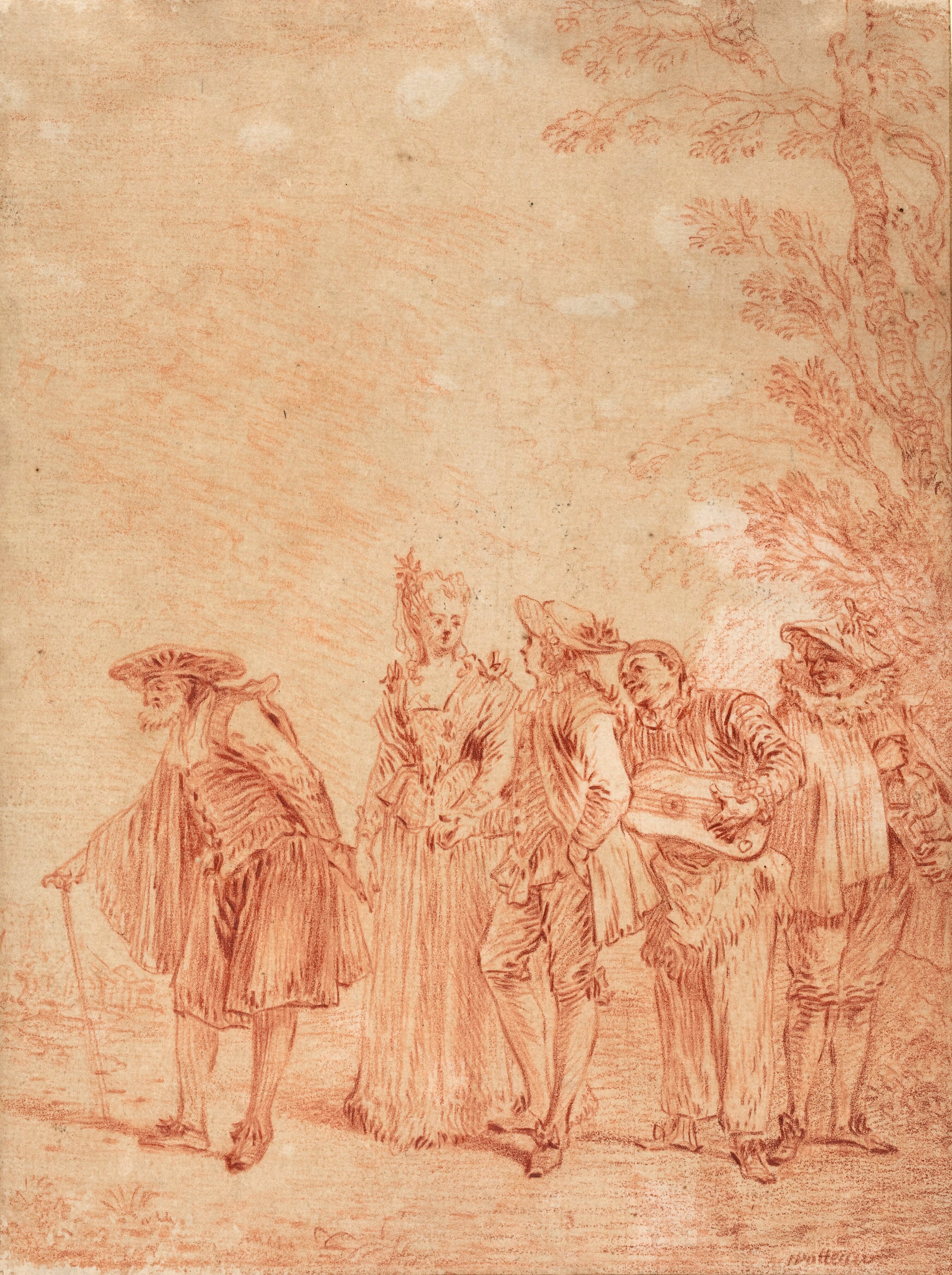 Watteau’s extant drawings offer insights into the various ways that he formed La Mariée de village. A sheet in the Louvre with five red chalk studies of a standing man (Rosenberg and Prat 99) was one of the sources for the painting. The man at the left of the drawing, seen from behind, his hat tucked under his arm, was used for a man who appears in the left foreground of the painting.