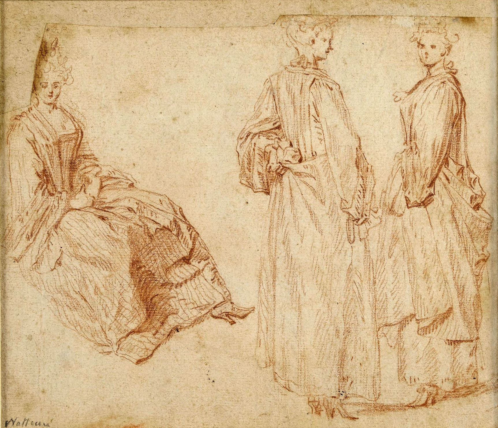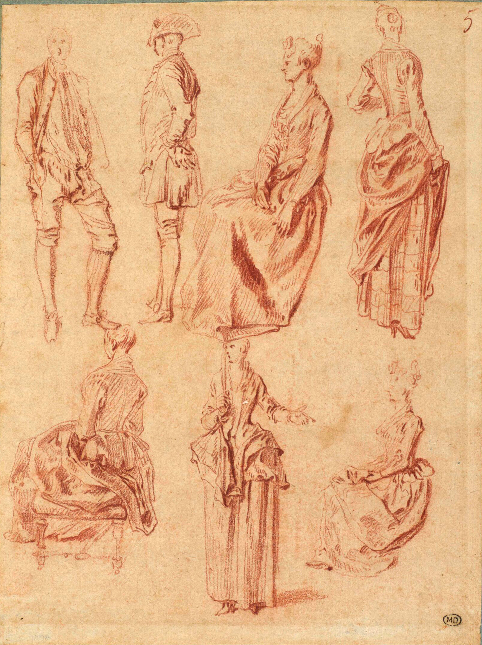 Watteau, Seven Studies of Women and Men, 23.2 x 17.4 cm, red chalk, Dijon, Musée des beaux-arts.