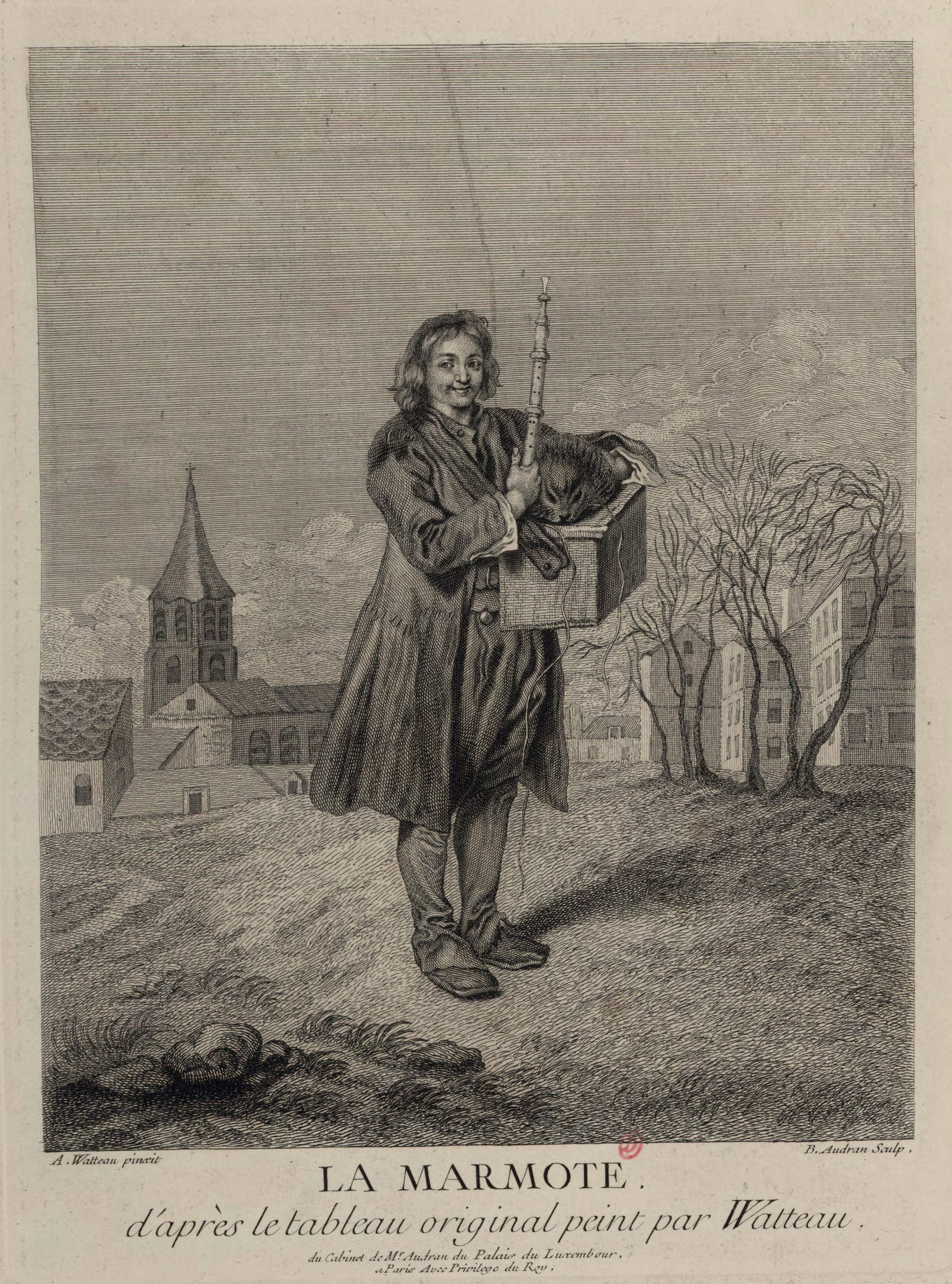 Originally La Marmote was coupled with a pendant, La Fileuse, a picture showing a country woman with a distaff. The same compositional formula was used for both: a central figure facing the viewer and a distant townscape running across the background. The two paintings were together in Claude III Audran’s collection when they were engraved by Benoît Audran in 1732. They were probably still together after 1772, as shown by the listing of two Watteay paintings in the estimate of countess Redern‘s collection, where they are referred to as “La Bergère” and “Montreur de marmottes.” At some point before 1774, the pendants were separated; La Marmote entered the Russian royal collection while La Fileuse went for auction in 1776 (see the entry fo La Fileuse).