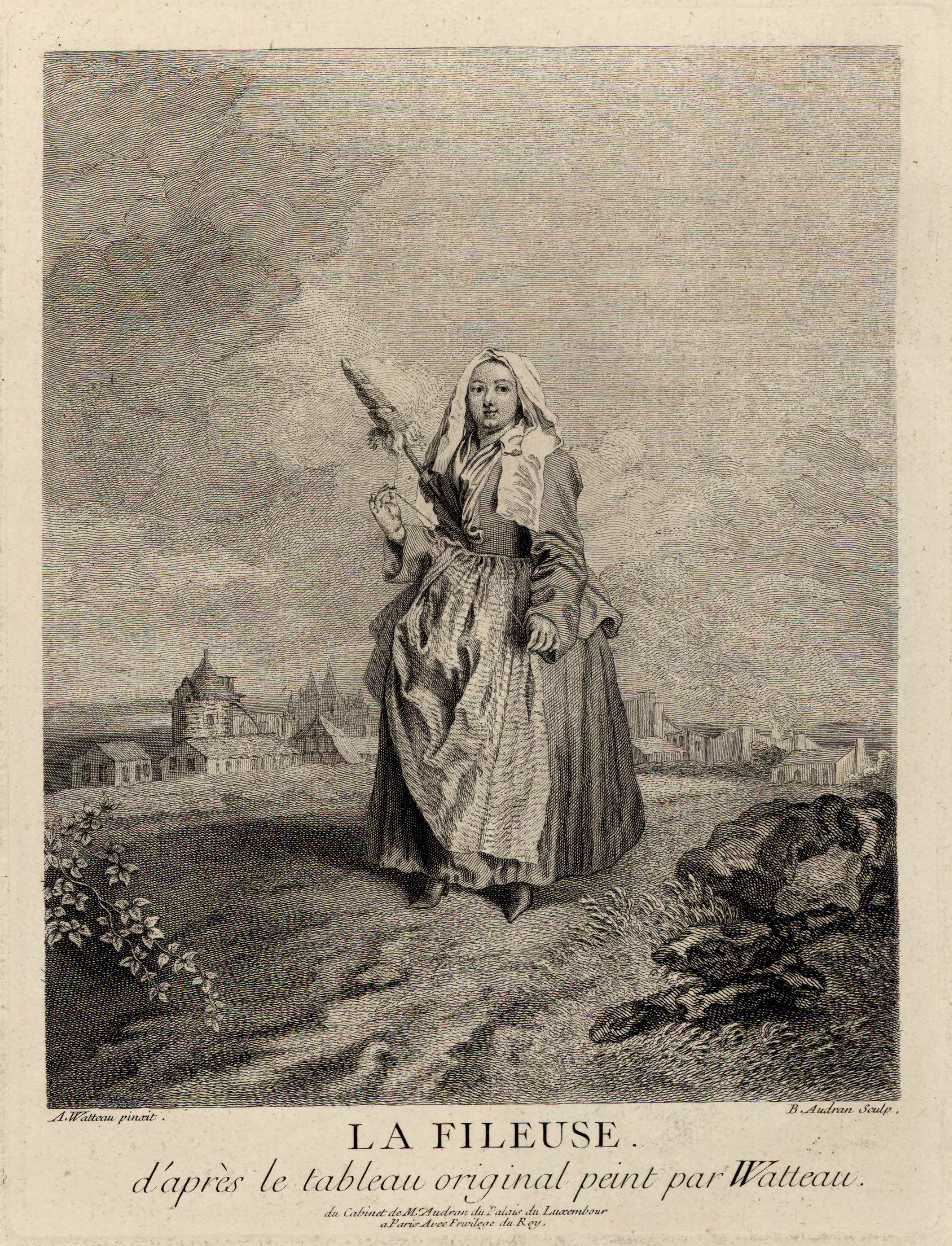 Benoît II Audran, La Fileuse, engraving, c. 1732.