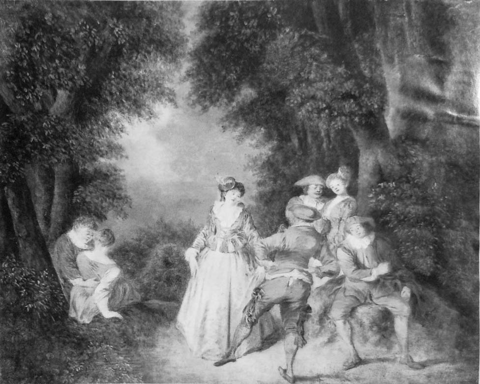 Ferré classifies this painting as possibly by Watteau (his “B” category). Its format and composition correspond to Watteau paintings such as Voulez-vous trimpher des belles? where Harlaquin makes unwanted advances on his female companion and she recoils, her hand to her breast. Reduced in scale, a secondary group behind them consists of a guitarist seen from behind, a woman reading a part book, and as well a man looking down at the book. While the narrative is essentially the same in this anonymous fête galante, the rendering is naïve and far removed from Watteau. Even if a comparison is made with works by Pater, an artist to whom this painting has been attributed (and justly so), this painter still falls far short of the mark. Whether he worked with Pater or imitated him at a slight remove, this painter shows a definite and spirited personality.
