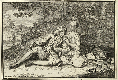 Some of the paintings displayed in this hall, and which can be rotated by the mechanical wheels on the back side, are telling witnesses. A picture closing off a fireplace, a devant de cheminée, is a Dutch seventeenth-century genre scene. Another, a lunette high on the wall, shows an amorous couple seated on the ground; this copies an engraved Allegory of Smell by Bernard Picart. Such quotations reinforce the idea that we are looking at the work of a minor pasticheur.