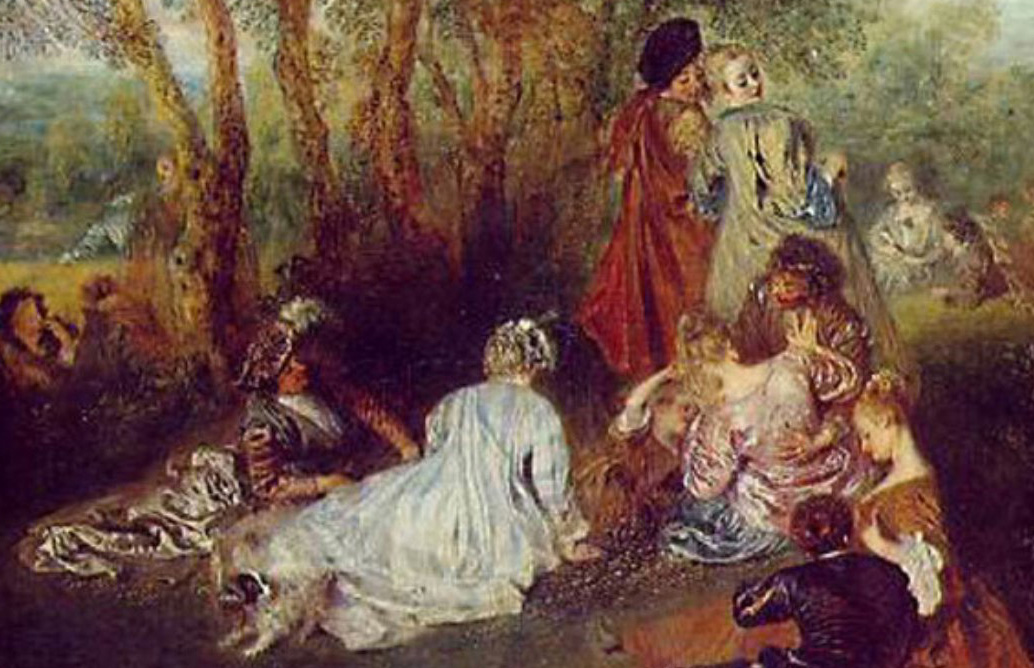 The diminutive figures in the background of Réunion galante dans un parc, both those reclining on the ground and those walking away, are based upon some of the striking figures in the foreground of Watteau’s Plaisirs d’amour in Dresden, although they are simplified and modified.