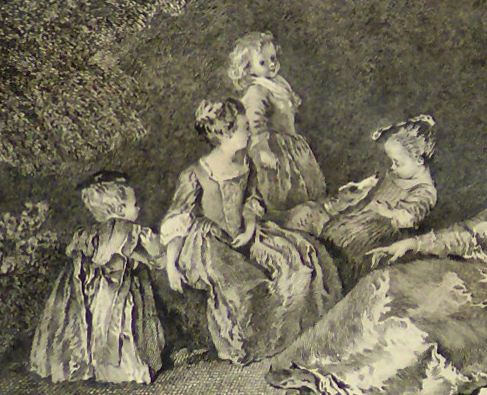Jacques Philippe Le Bas after Watteau, L’Assemblé galante (detail), here reversed to the original direction of the painting.
