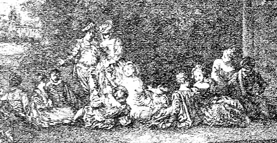 In 1970, as part of my study of Quillard and his relationship with Watteau, I proposed that the Madrid paintings had been executed jointly by the two artists and in a manner reflecting their relative positions. The principal figures, those in the foreground, are excellently painted and correspond in every nuance to Watteau’s style. On the other hand, the figures in the middle ground are quite different and correspond to Quillard’s manner. The flickering brushwork and nervous poses are characteristic of his style, not Watteau’s. They should be compared, for example, with similarly posed figures in one of Quillard’s etchings, Amusemens champêtres or, as it is also known, La Leçon de chant. The upturned face and extended neck of the woman and the perilous incline of the strolling couple are identical in the two works. In contrast, the same figures in Le Bosquet de Bacchus and the painting in Valenciennes are more stable and more conventionally proportioned. The differences between these two artists are so strong that one can only wonder why scholars have not acknowledged them.