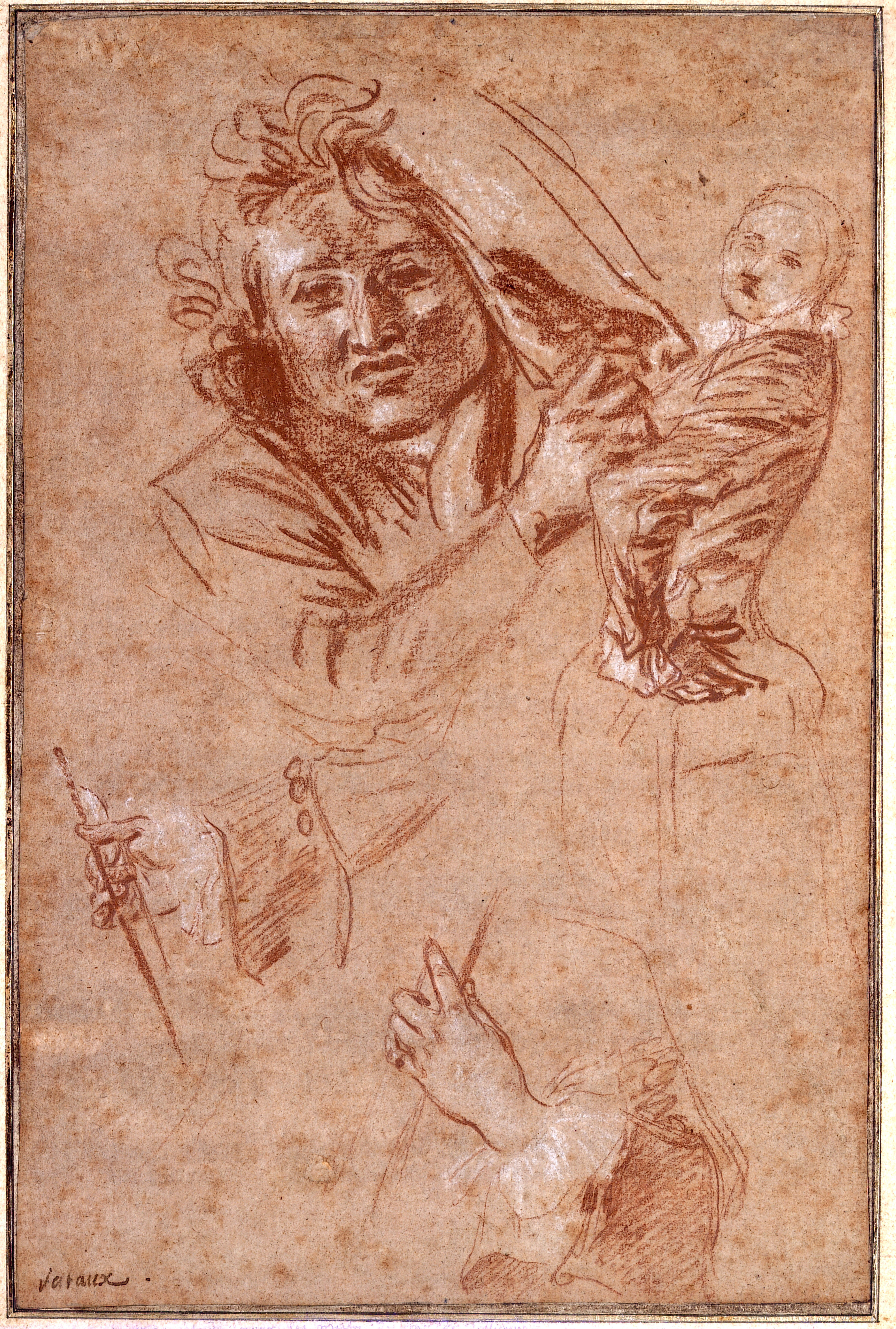 Watteau, Sheet of Studies of a Man’s Face, an Actress Standing with her Arm Akimbo, and Two Hands Playing a Viola da Gamba, red and white chalk, 26.9 x 17.5 cm. Los Angeles, Collection of Ariane and Lionel Sauvage.