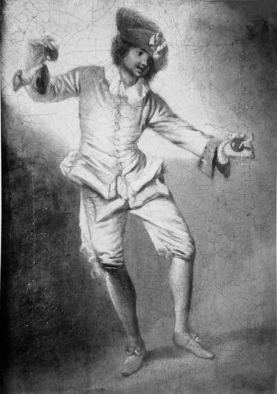 This picture repeats just the principal male dancer in Le Bal champêtre. As an independent figure, it recalls Watteau’s celebrated L’Indifférent in the Louvre, which also shows an actor in an attitude of the dance. But L’indifférent also includes a landscape setting whereas here just some brushwork fills in the background in a meaningless way.Rey, like other scholars of that time, believed that this painting was actually by Watteau and, moreover, that it inspired Mercier’s Le Danceur aux catagnettes. That proposed relationship confuses the issue unnecessarily since both the Mercier composition and this painting derive from Watteau’s Le Bal champêtre.