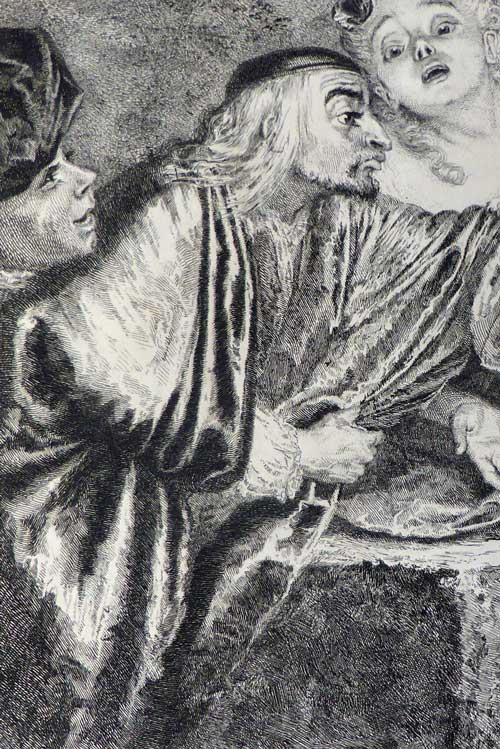 Mariette described the painting in more precise terms: “Un sujet grotesque, représentant un médecin qui tâte le pouls à un chat malade.” In essence, a woman is holding a cat in a large cloth and a man holds one of the animal’s legs. A boy at the right looks on intently. The cat’s expression seems to be one of fright and anger.